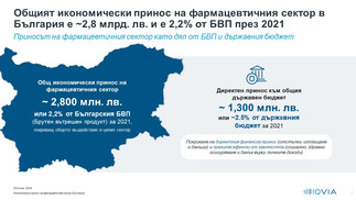Общият принос, който фармацевтичната индустрия е осигурила за 2021 г. за българската икономика се изчислява приблизително на 2,8 млрд. лева или 2,2% от брутния вътрешен продукт на страната, което е в съответствие със средното за Европа ниво. Тези и други данни бяха представени за първи път от г-н Лука Чичов, изпълнителен директор на IQVIA за Централна и Източна Европа, в рамките на доклад, изнесен на 30 май 2023 г. по време на експертна среща „Икономически и стратегически принос на фармацевтичния сектор в България“.